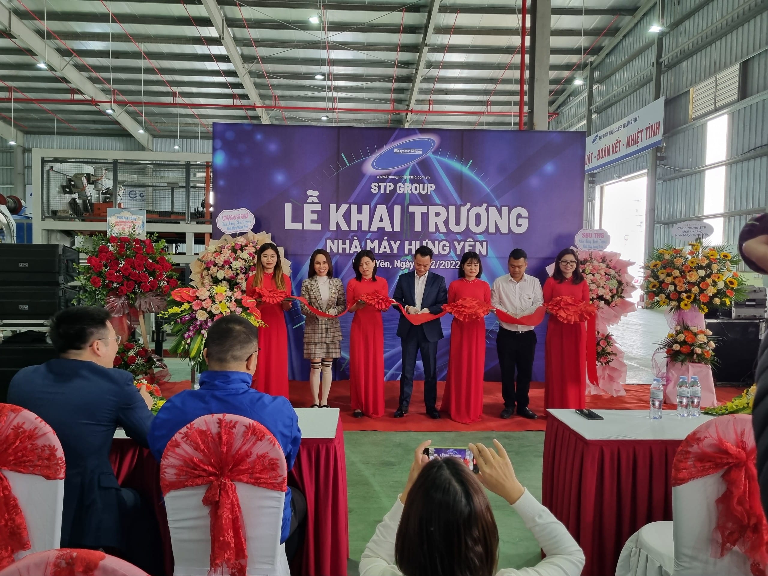 Chủ tịch HĐQT Ông Phạm Quốc Chính (giữa), Tổng giám đốc Bà Nguyễn Thị Hải Bình (thứ 2 bên trái) và Quản đốc nhà máy Ông Nguyễn Xuân Đại (thứ 2 bên phải) cắt băng khánh thành tại Nhà máy Hưng Yên